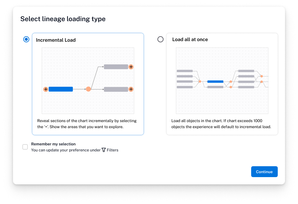 To reduce visual overload and improve performance in large lineage graphs, we introduced incremental loading—allowing users to reveal objects step-by-step rather than loading the entire graph at once. This created a more exploratory, “choose your own route” experience, letting users follow the paths most relevant to them without system lag.