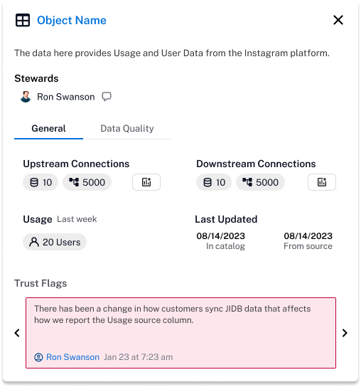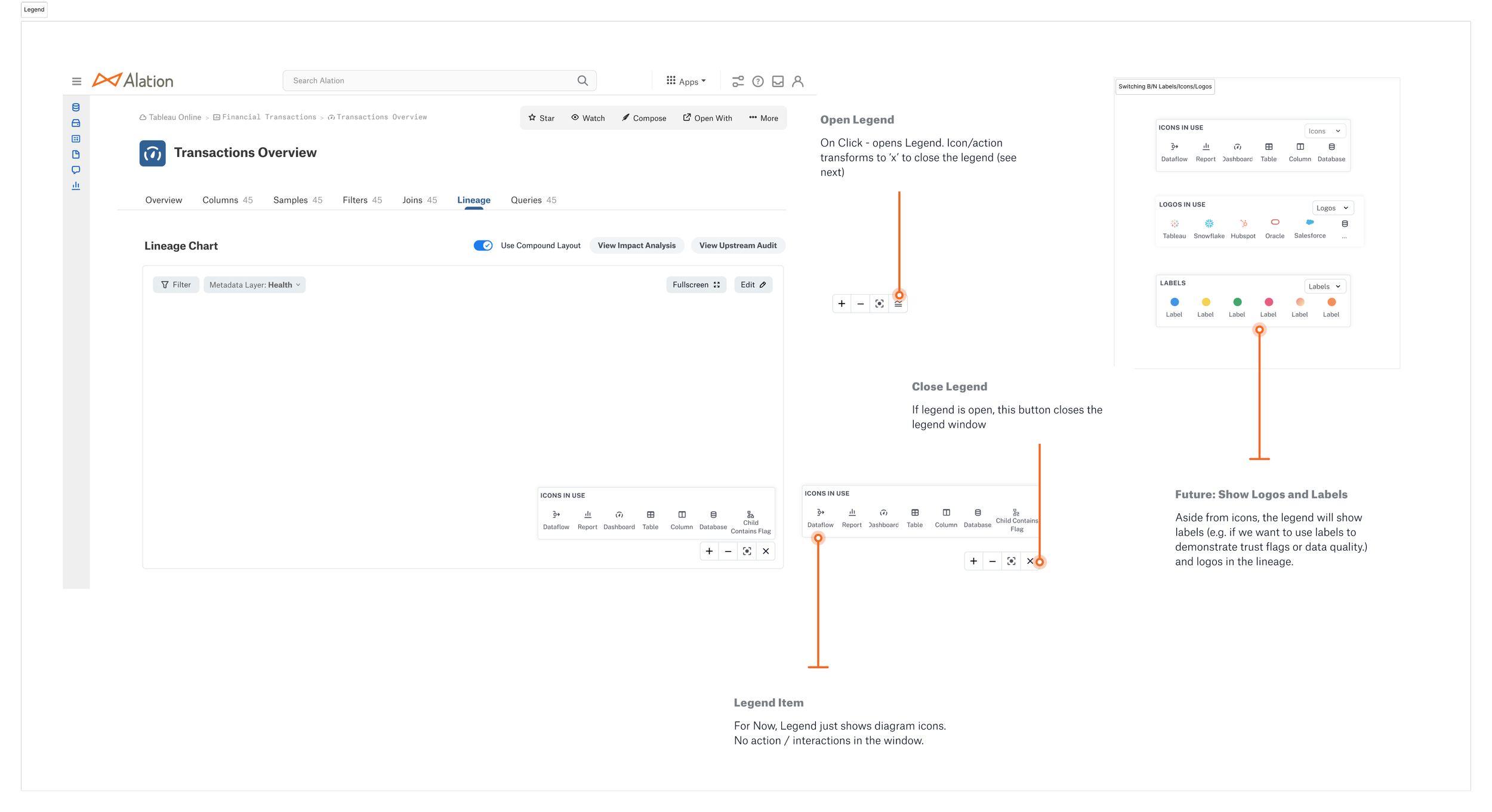 To help users make informed decisions directly from the lineage view, I designed a metadata overlay system that adds critical context without overwhelming the visualization. This layer surfaces trust flags (endorsed, deprecated, warning), custom fields (e.g., PII, GDPR, or any user-defined tags in Alation), and data quality indicators directly on lineage nodes.
