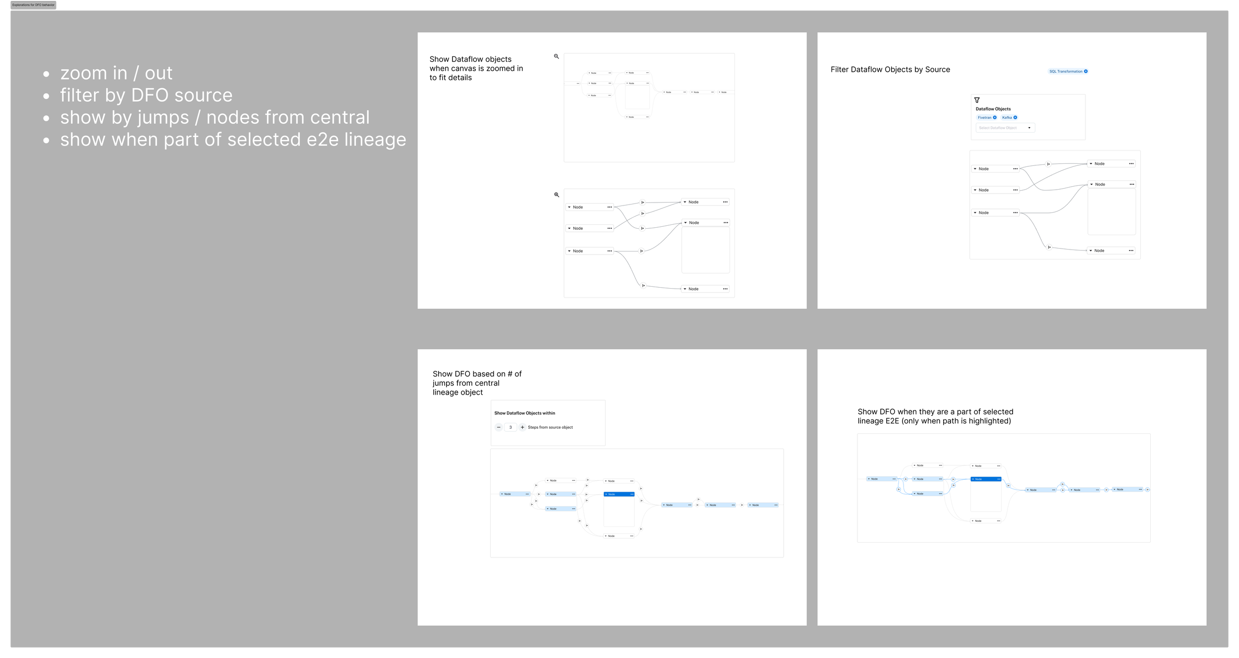 One of the biggest usability challenges in the lineage experience was the overabundance of Data Flow Objects (DFOs)—nodes that represent transformations, joins, and queries. In many cases, these objects flooded the view with repetitive or irrelevant information, including duplicates or even deleted DFOs that no longer provided value. This visual noise made it difficult for users to follow the meaningful flow of data between sources, transformations, and destinations.